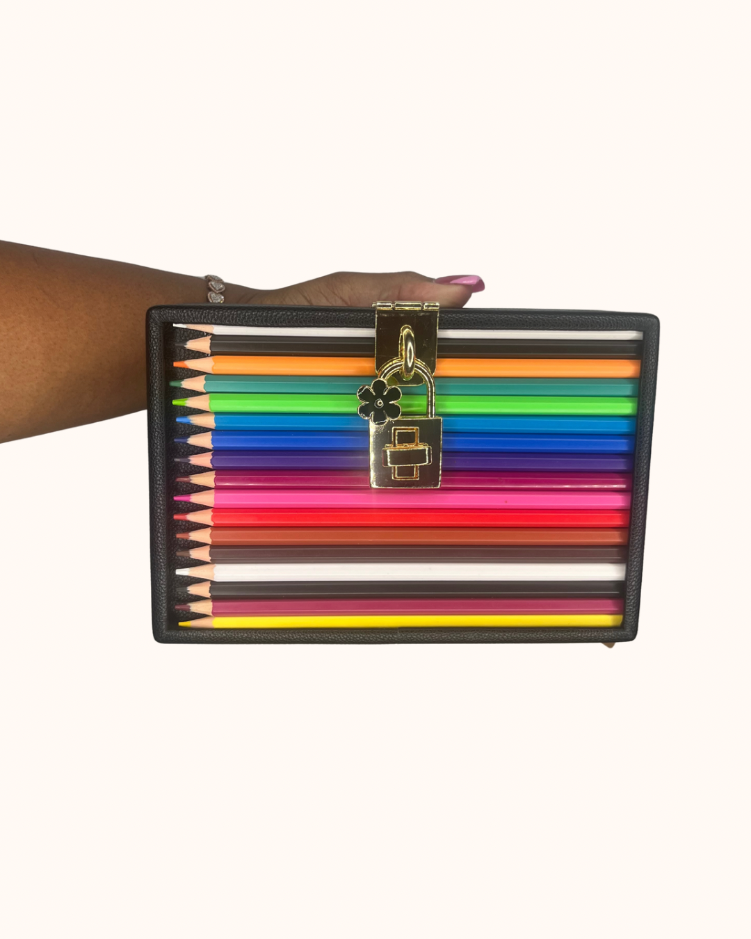 Where fashion meets creativity! The Lavish Lockette is a one-of-a-kind pencil case-style purse designed for stylish little trendsetters with big imaginations. Featuring real colored pencils across the front and a working locket charm for secret notes or tiny treasures, this bag is both playful and practical.